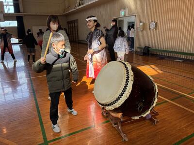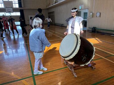 そして、最後に全員が太鼓を叩く経験をさせていただきました。
