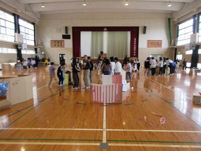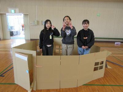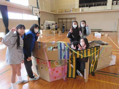 4年生1,2組合同で、体育館で図画工作科「ようこそ!ゆめのまちへ」の学習を行いました。たくさんのダンボールを組み合わせながら自分のイメージをのびのびと広げ、家やお店、トンネル等を熱心に製作しました。最後には、すてきなまちが体育館に広がりましたまた、1年生に来てもらい、いっしょに笑顔で遊ぶことができました。友達と協力して片付けも行い、とても楽しい時間となりました。
