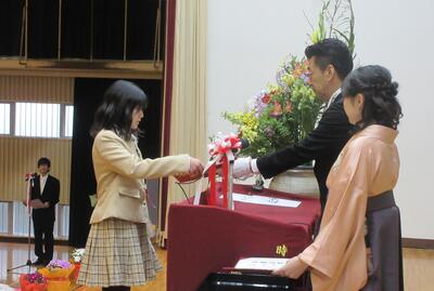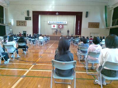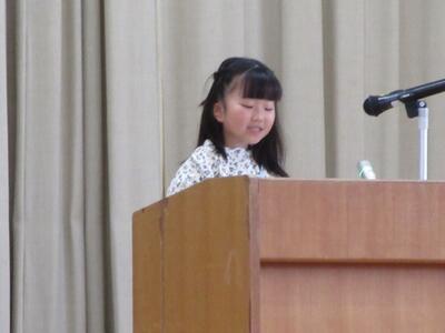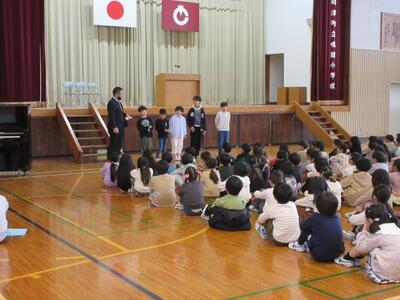 本日24日は、修了式でした。各学年の代表児童が校長先生から受け取りました。校長先生からは、3つの幸せ(してもらう幸せ・できるようになる幸せ・してあげる幸せ)についての話がありました。児童代表のことばでは、1年の多比良さん、白倉さん、4年の西村さんの作文発表がありました。3人とも、この1年間にがんばったことや次の学年でがんばっていきたいことなどをしっかりと表現することができました。また、転校する児童の挨拶もありました。最後は、生活指導主任が春休みの生活について話をしました。いよいよ明日から春休みです。8日(火)の始業式の日に会えるのを楽しみにしています。