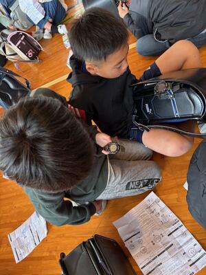 鳴鼓小では、毎朝、集団登校をしています。「7時○分に、○○に集合」というきまりで、班が集合して学校へ向けて出発しています。集合場所で現時刻が分からず、出発するにもできないことが度々あったようです。この課題を解決するために班長に時計を持たせることを、以前から検討してきていました。今回、ようやく準備することができました。財団法人の日本教育公務員弘済会様からの活動助成金を購入費にあて、各班長に持たせています。早速、21日の集団登校の時から活躍するのではないかと思います。また、この時計は、修学旅行や宿泊学習などのグループ活動時にも使用する予定です。時計をランドセルに付けた各班長は、班長としての自覚が更に高まったのではないかと思います。